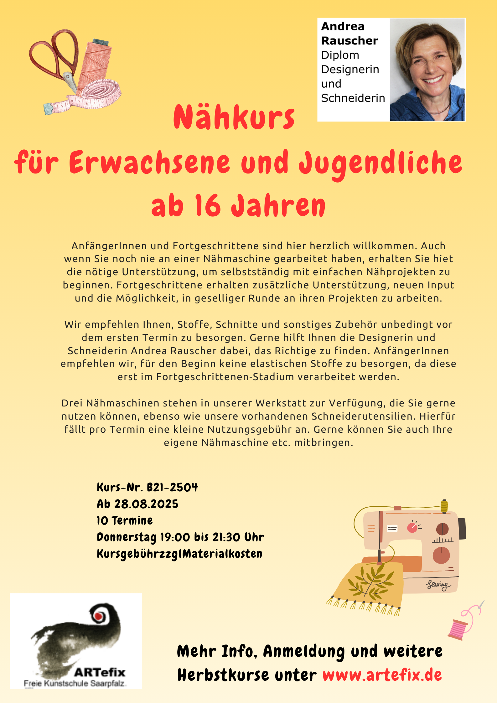 - Nähen für Erwachsene und Jugendliche ab 16 Jahren, ab 28. August im ARTelier Blieskastel