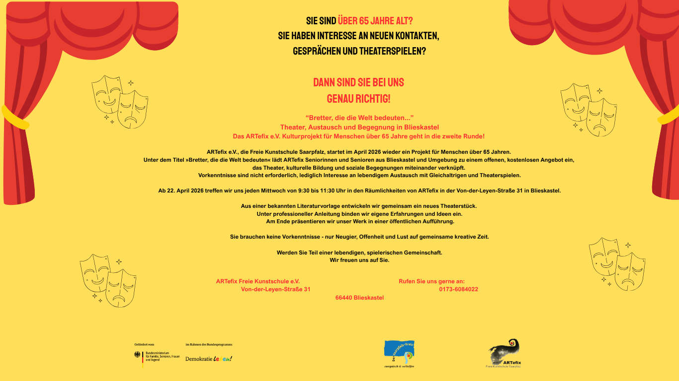 Nach dem großen Erfolg im vorigen Jahr geht ARTefix e.V., die Freie Kunstschule Saarpfalz, mit dem Projekt 65+ „Auf den Brettern, die die Welt bedeuten“ in die nächste Runde.