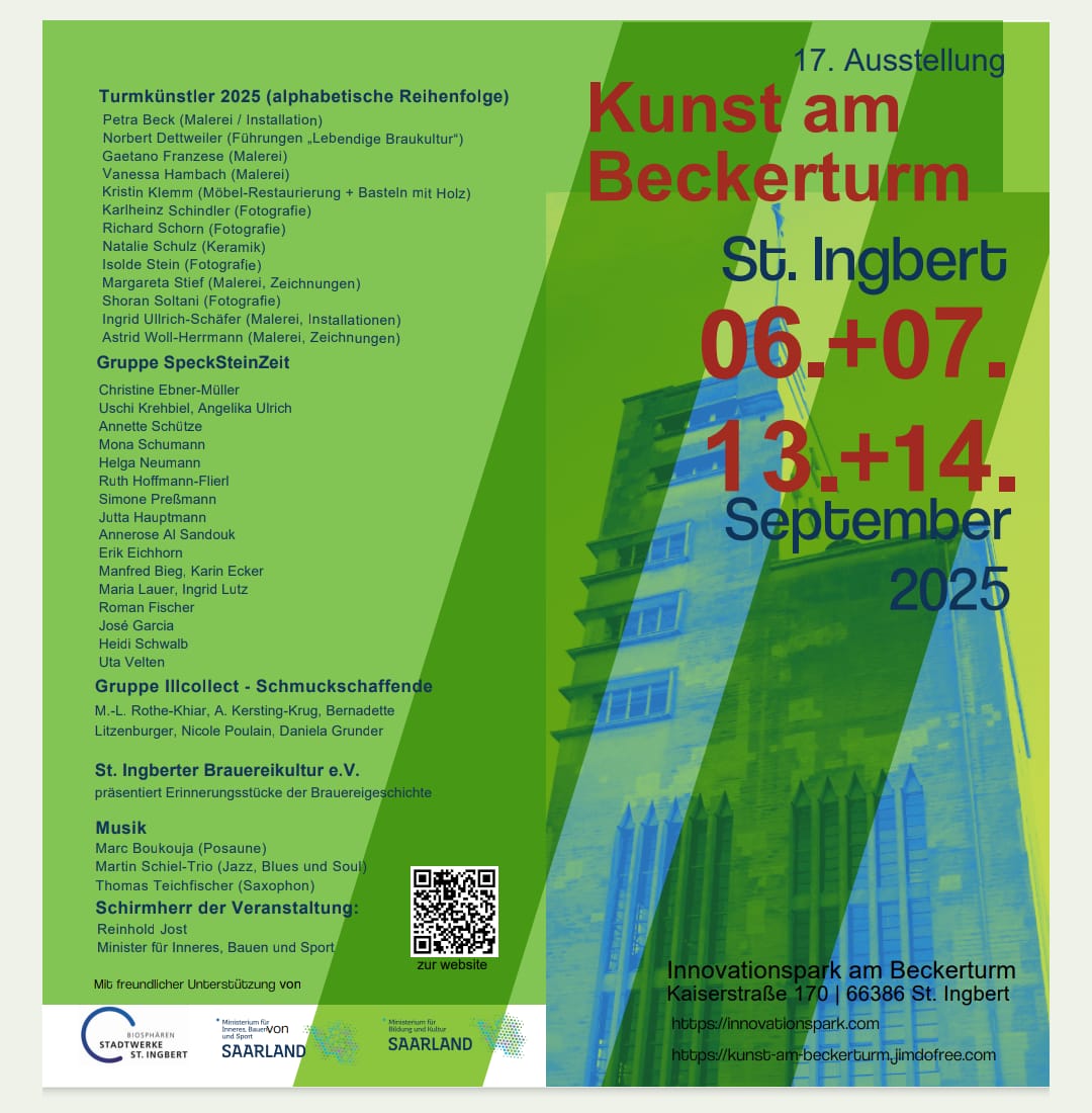 Im historischen Beckerturm in St. Ingbert präsentieren die Turmkünstler schon zum 17. Mal ihre neusten Werke. Alle leben und arbeiten in der Region, manche sogar direkt im Turm. Schirmherr ist Reinhold Jost, saarländischer Minister für Inneres, Bauen und Sport. Die Künstler sind während der ganzen Ausstellung anwesend und freuen sich auf regen Austausch mit den Besuchern.