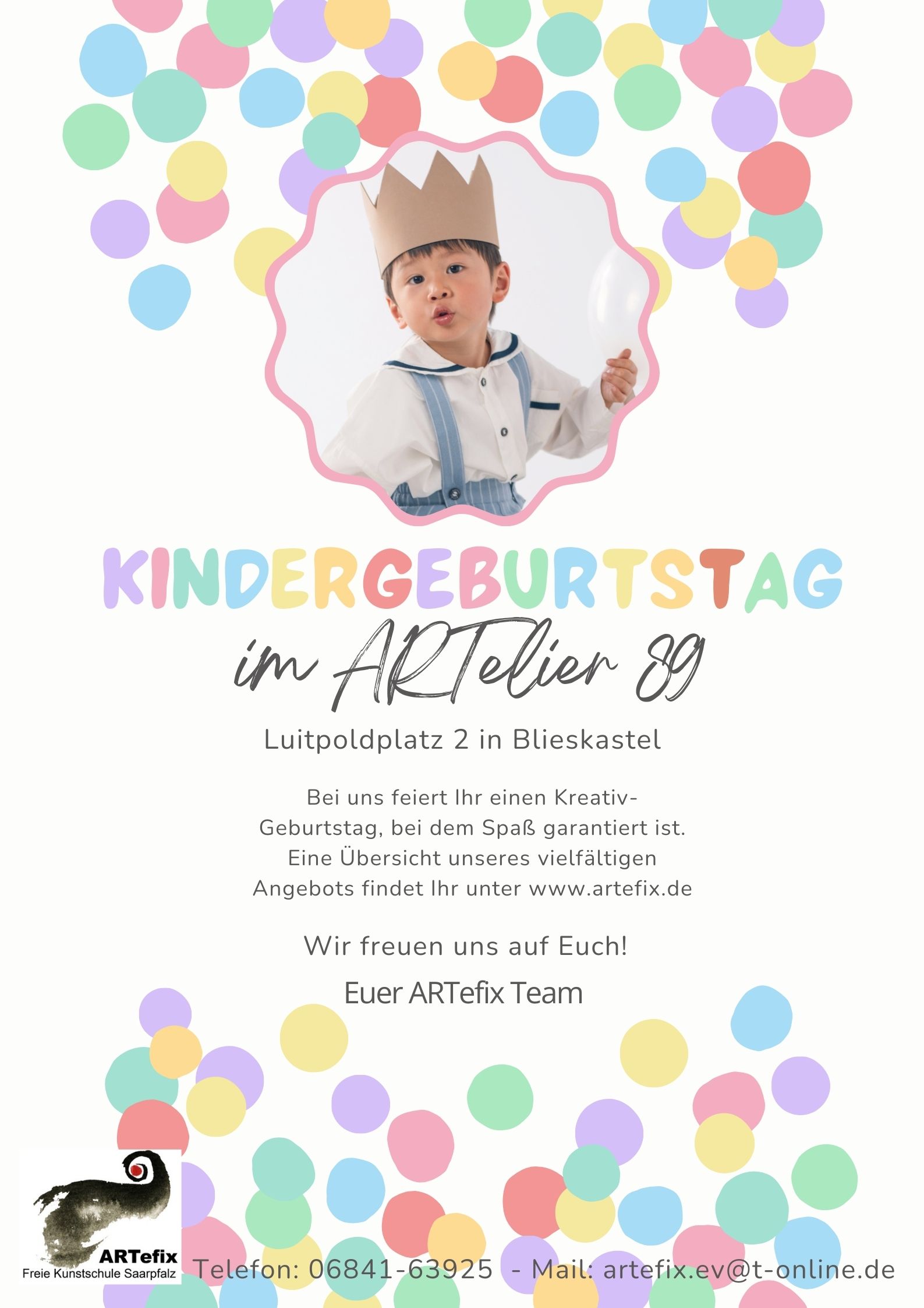 Ganz entspannt können sich die Eltern zurücklehnen, während sich das Geburtstagskind und die Geburtstagsgäste in unserem schönen ARTelier 89 in Blieskastel kreativ ausleben. Kerzen auspusten und Kuchen essen sind dabei natürlich selbstverständlich.